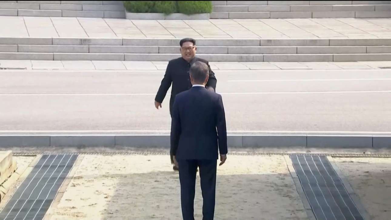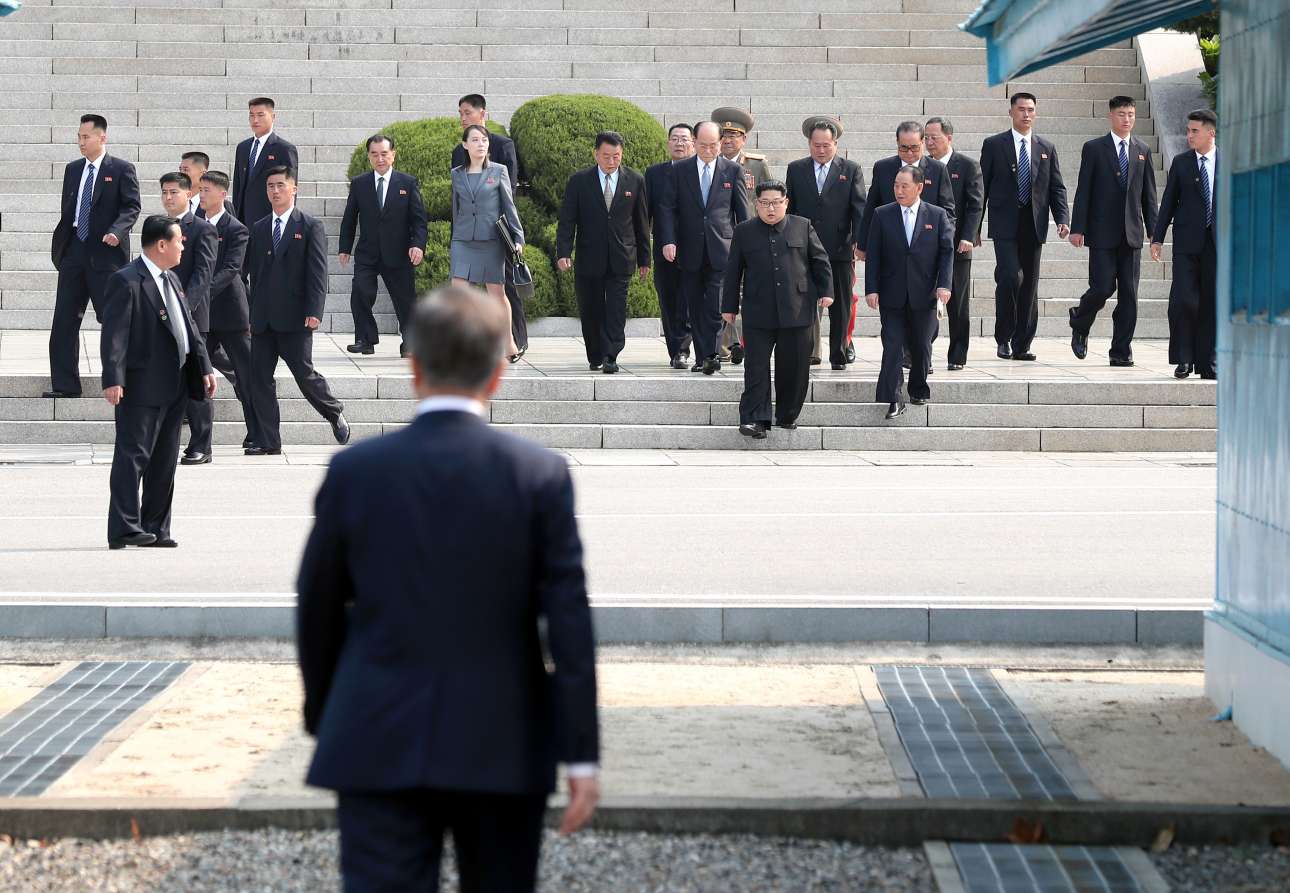 Μερικές στιγμές πριν. Ο Κιμ Γιονγκ-Ουν αντικρίζει μαζί με τα υπόλοιπα μέλη της βορειοκορεατικής αντιπροσωπείας -και φυσικά τους πολυάριθμους σωματοφύλακες- τον πρόεδρο της Νοτίου Κορέας Μουν Τζάε-Ιν ο οποίος σπεύδει και αυτός στο σημείο της συνάντησης