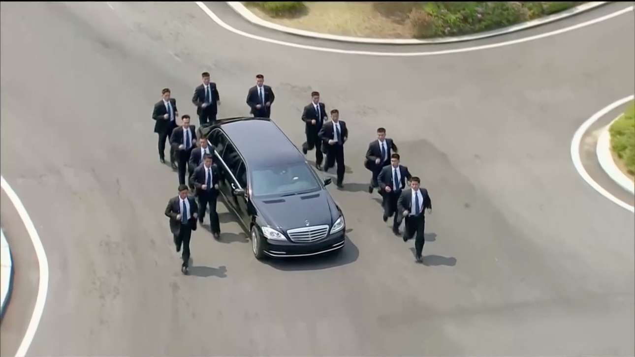 Ανδρες της προσωπικής ασφάλειας του Κιμ τρέχουν πέριξ της Mercedes του βορειοκορεάτη δικτάτορα κατά την άφιξή του στον χώρο της ιστορικής συνάντησης