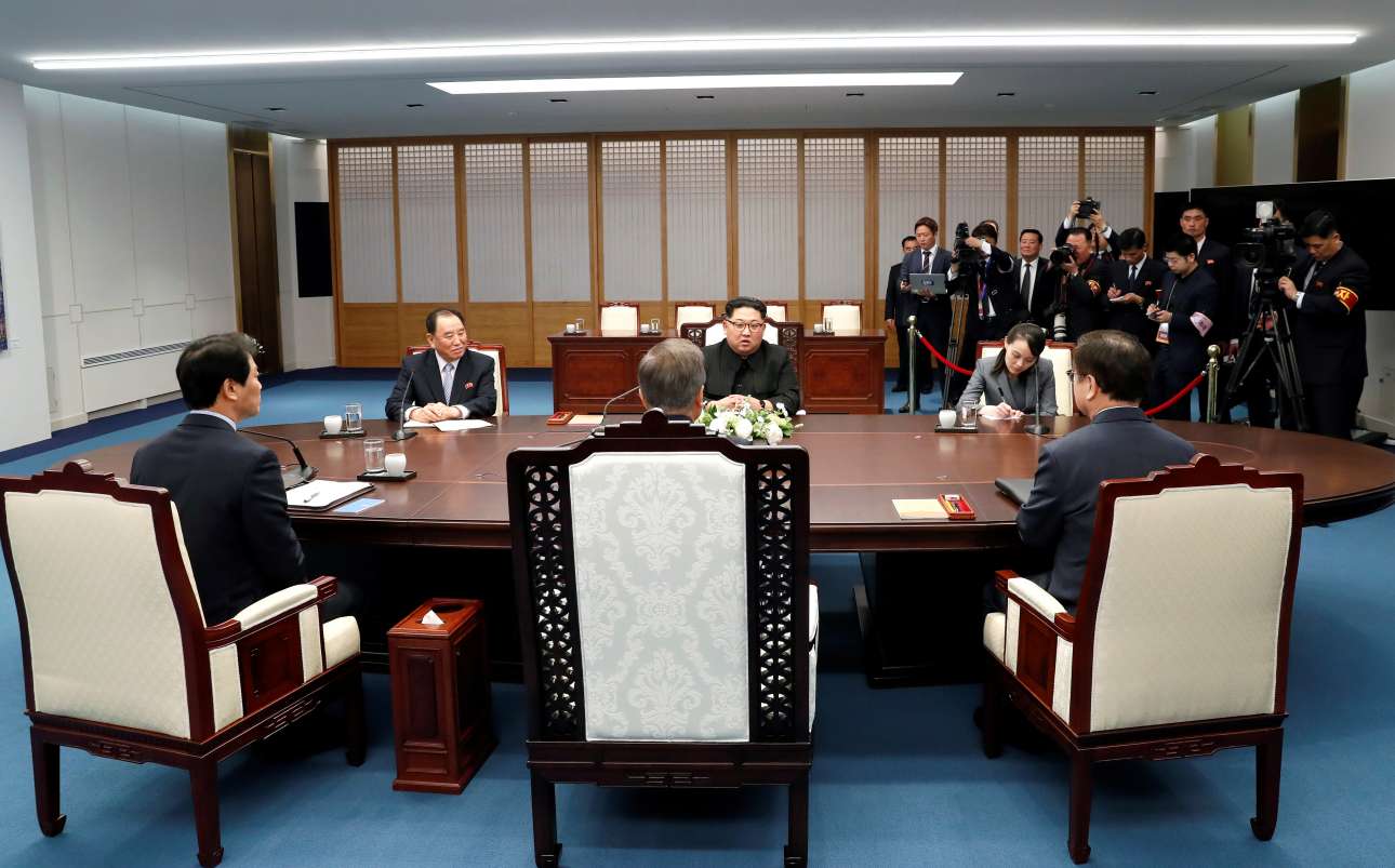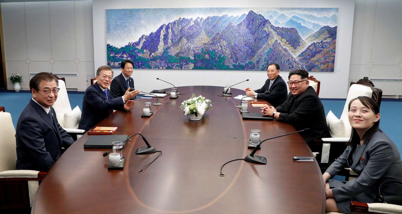 Οι δύο παρατάξεις. Τον Μουν και τον Κιμ τους χωρίζουν ακριβώς 2.018 χιλιοστά του μέτρου. Στα δεξιά η Κιμ Γιο-Γιονγκ, αδελφή του Κιμ Γιονγκ-Ουν
