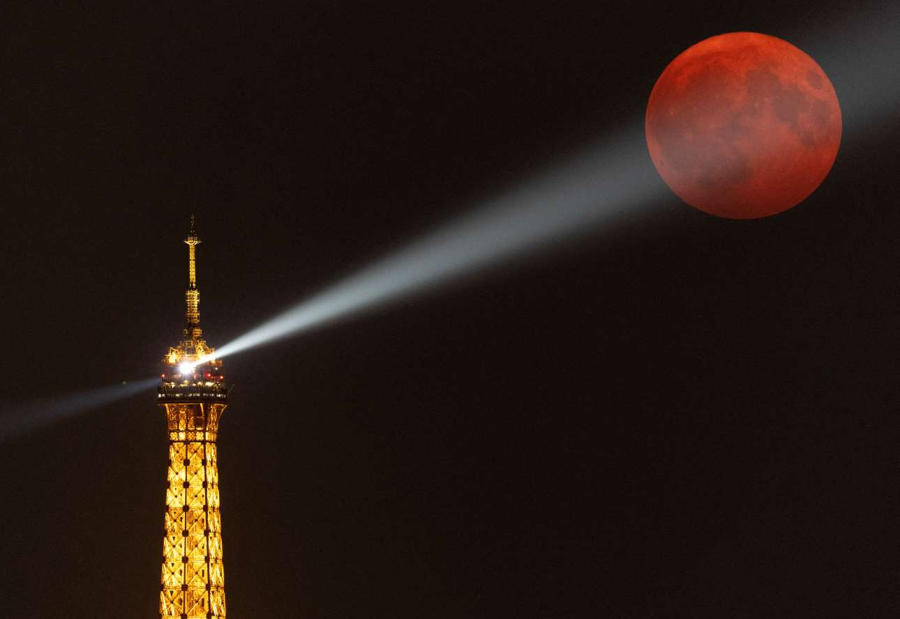 Ο Πύργος του Αϊφελ στο Παρίσι «παίζει» με την Πανσέληνο που έχει αποκτήσει ένα κοκκινωπό χρώμα