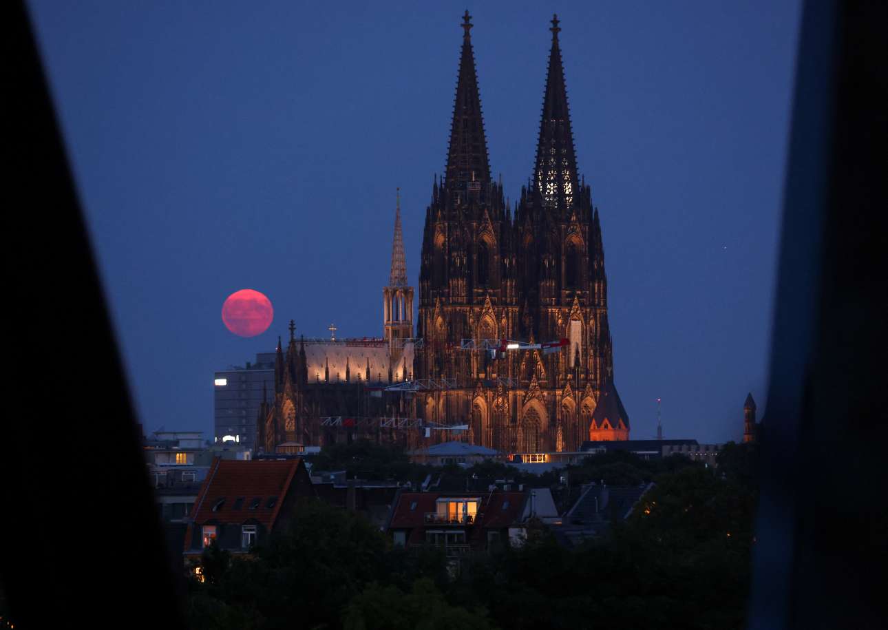 H πανσέληνος του Αυγούστου, γνωστή και ως «Πανσέληνος του Οξύρρυγχου» ανατέλει πίσω από τον μεγαλοπρεπή καθεδρικό ναό της Κολωνίας, στη Γερμανία