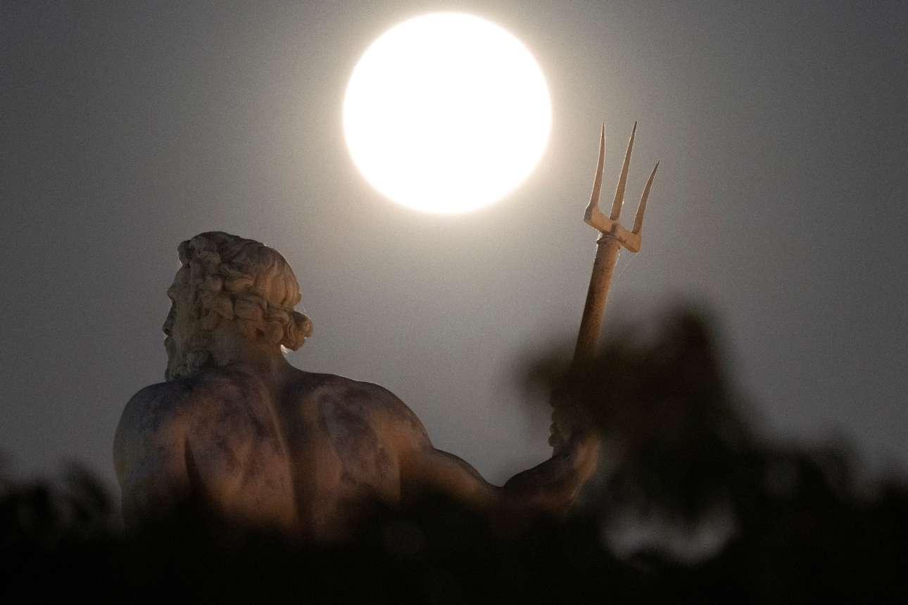 O... Ποσειδώνας έχει ξανά την τιμητική του: εδώ η πανσέληνος αναδύεται πίσω από το άγαλμα του αρχαίου θεού στην Κοπεγχάγη της Δανίας