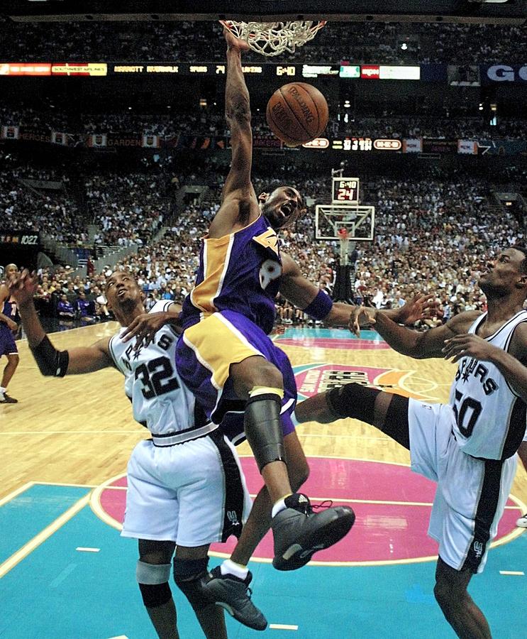 Μάιος 2001, Σαν Αντόνιο. Παρά την αντίσταση των Σον Ελιοτ (αριστερά) και Ντέιβιντ Ρόμπινσον ο Κόμπι καρφώνει στο καλάθι των Σπερς στο πρώτο ματς των τελικών της Δύσης