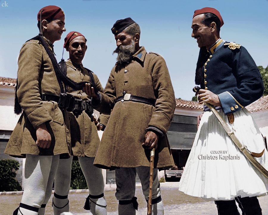 Αθήνα, 1955. Ο υπέργηρος Μακεδονομάχος καπετάν Τρομάρας - Γιώργης Σερεβέτας στο στρατόπεδο των ευζώνων με τον Βαγγέλη Μπουκουβάλα, διοικητή της ανακτορικής φρουράς, και δύο εύζωνες