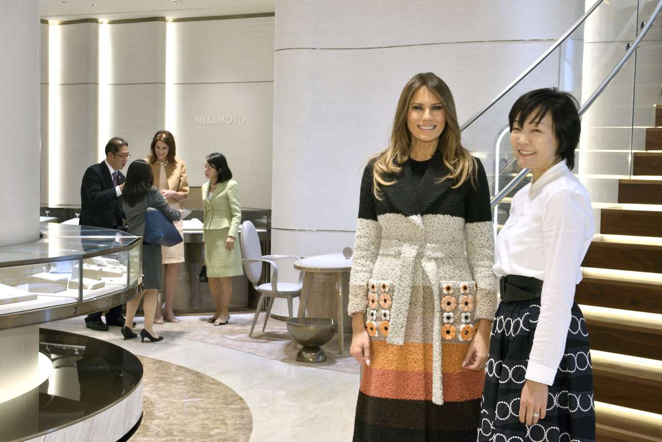 Στο διάσημο κατάστημα περλών Mikimoto με την Πρώτη Κυρία της Ιαπωνίας, φορώνας ένα ιδιαίτερο, πολύχρωμο παλτό με διακοσμητικά