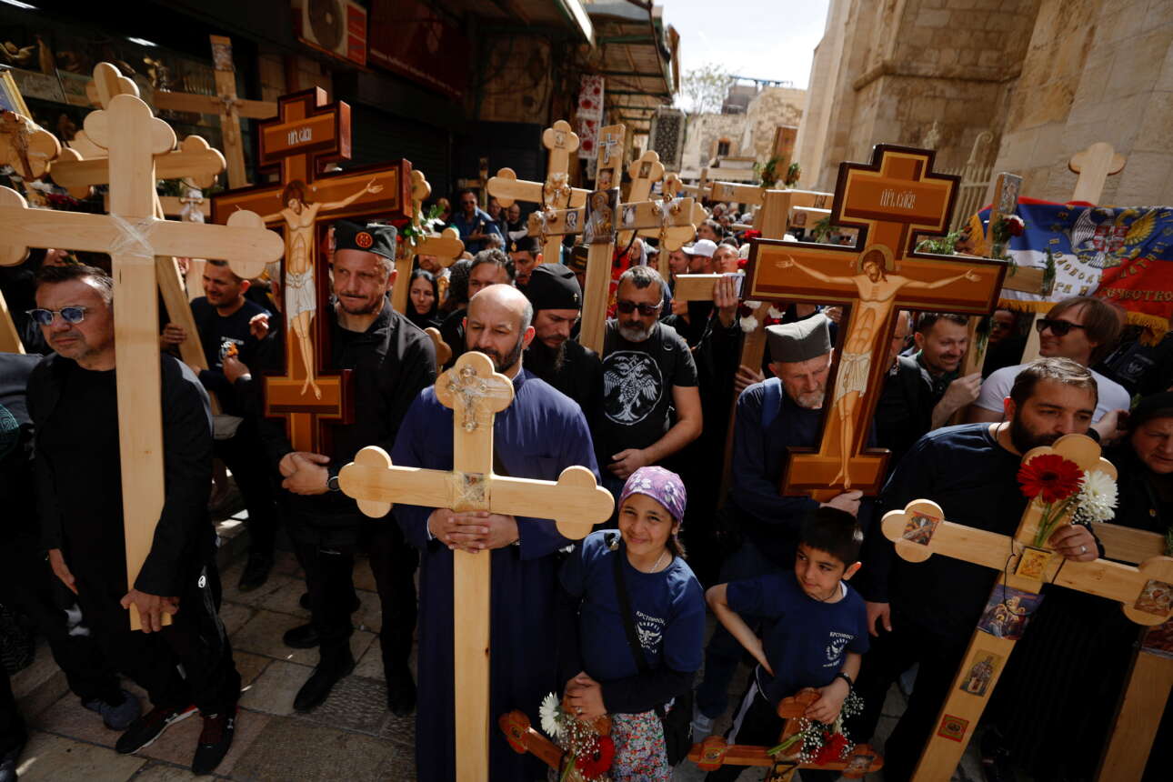 Προσκυνητές στην Ιερουσαλήμ περπατούν στην παλιά πόλη, κρατώντας στα χέρια τους ξύλινους Σταυρούς