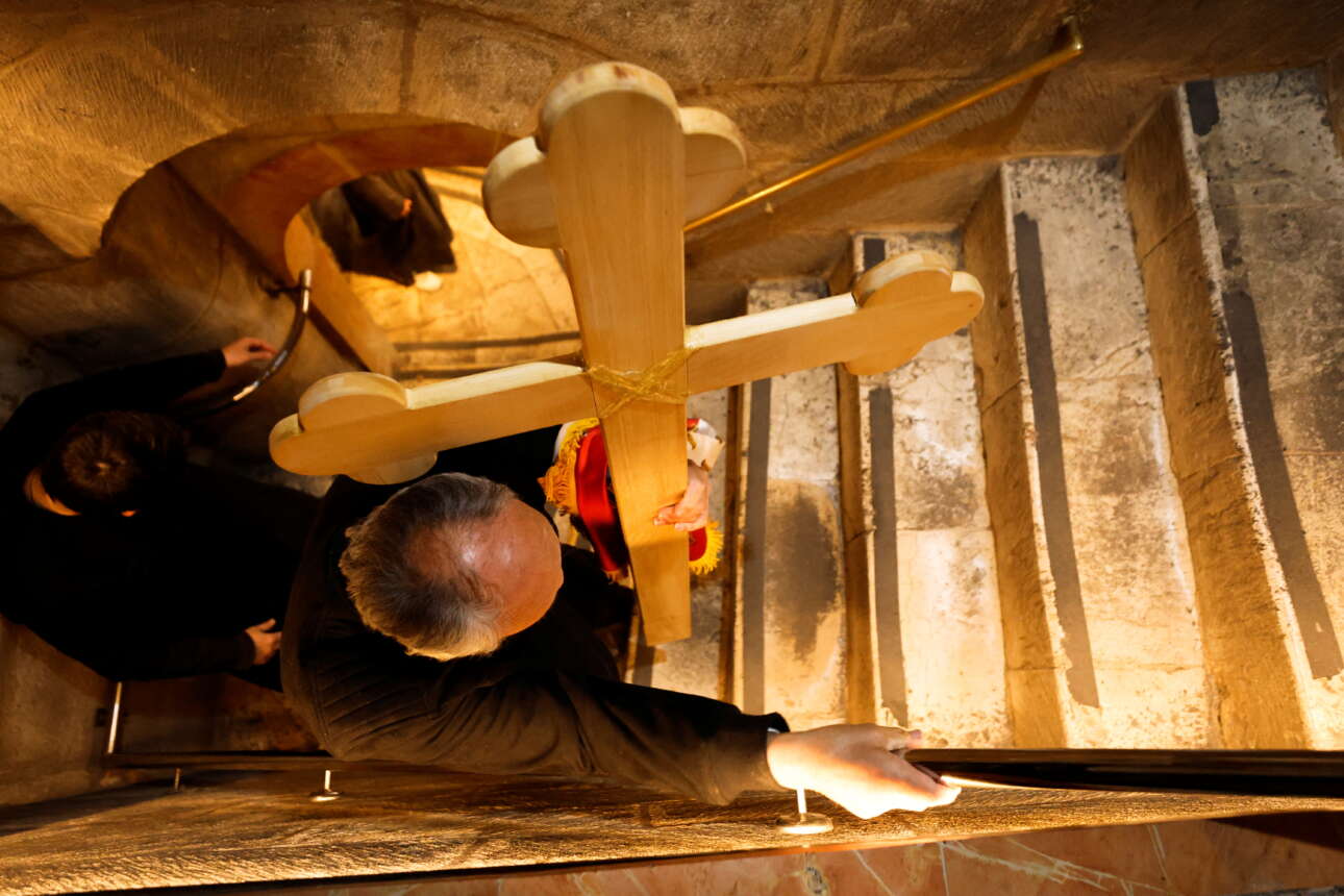 Προσκυνητής την ώρα της Θείας Λειτουργίας κουβαλάει τον Σταυρό στον ναό της Αναστάσεως στην Ιερουσαλήμ