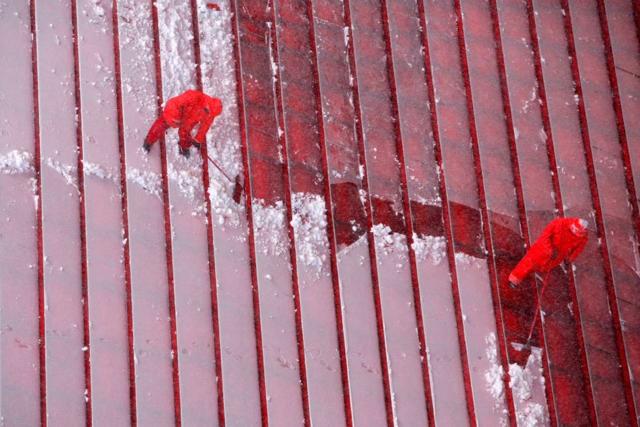 Υπάλληλοι του Δήμου καθαρίζουν τα χιονισμένα σκαλοπάτια στην περίφημη πλατεία της Νέας Υόρκης Times Square