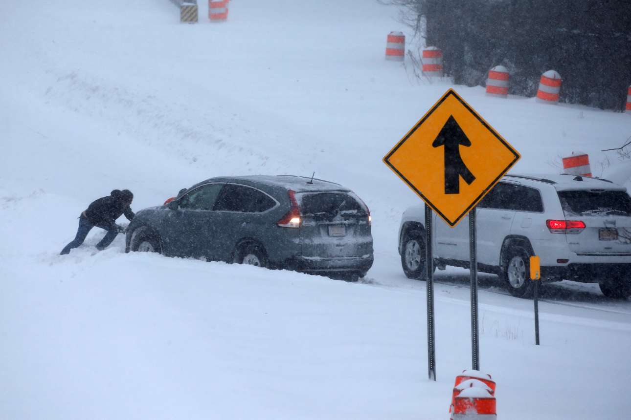Σαν σκηνή από κινηματογραφική ταινία, μια μαυροφορεμένη φιγούρα προσπαθεί να περπατήσει πάνω στους παγωμένους δρόμους της Νέας Υόρκης