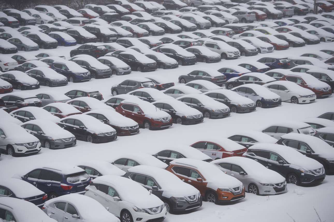 Πέπλο χιονιού σκεπάζει τα αυτοκίνητα σε μια μάντρα στην Πενσιλβάνια