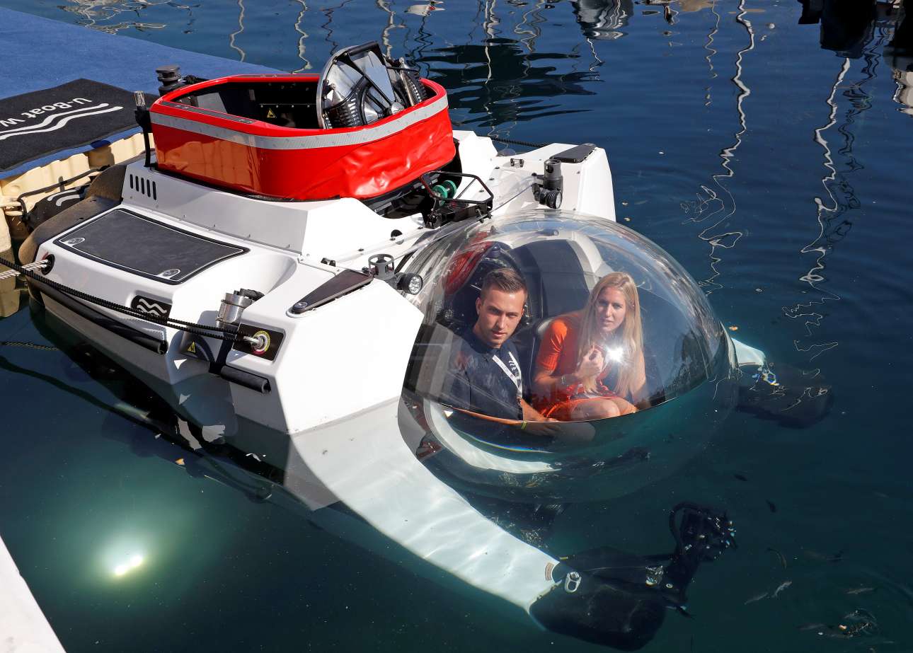 Επισκέπτες δοκιμάζουν το «Super Yacht Sub 3», ένα προηγμένο τεχνολογικά υποβρύχιο για τους ιδιοκτήτες των γιοτ που θέλουν να εξερευνήσουν τον βυθό