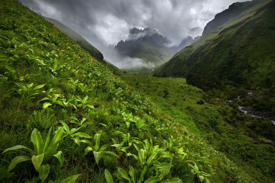 Μια απότομη κοιλάδα του βουνού, καλυμμένη με μικρά. Επιλαχών, Πρότζεκτ: "The Drakensberg", εικόνες από τα βουνά Drakensberg στη νότια Αφρική (2 από 3)