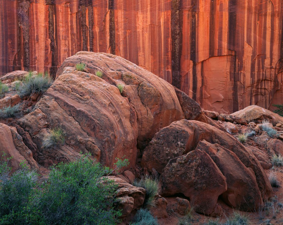 Μια κόκκινη πρόσοψη βράχου διακρίνεται πίσω από αρκετούς κοκκινωπούς ογκόλιθους. Επιλαχών, Φωτογράφος της Χρονιάς (3 από 3)