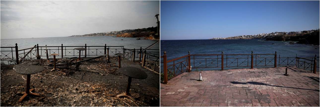 Τα καμένα τραπέζια και καρέκλες ενός παραθαλάσσιου καφέ μετά από πυρκαγιά στις 24 Ιουλίου 2018. Δεξιά, το ίδιο καφέ ένα χρόνο αργότερα στις 22 Ιουλίου 2019