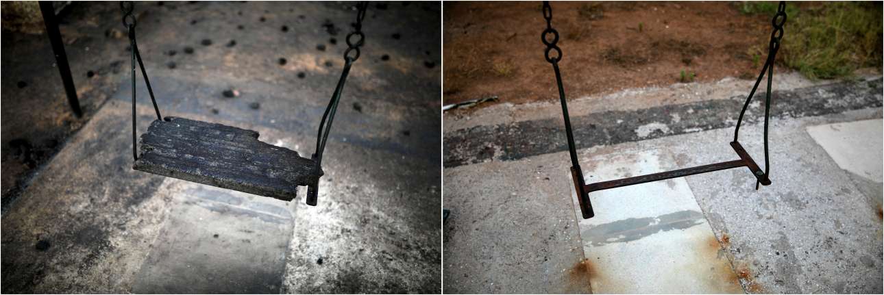 Κατεστραμμένη κούνια από την πυρκαγιά στις 25 Ιουλίου 2018. Δεξιά, η ίδια κούνια στις 23 Ιουλίου 2019,