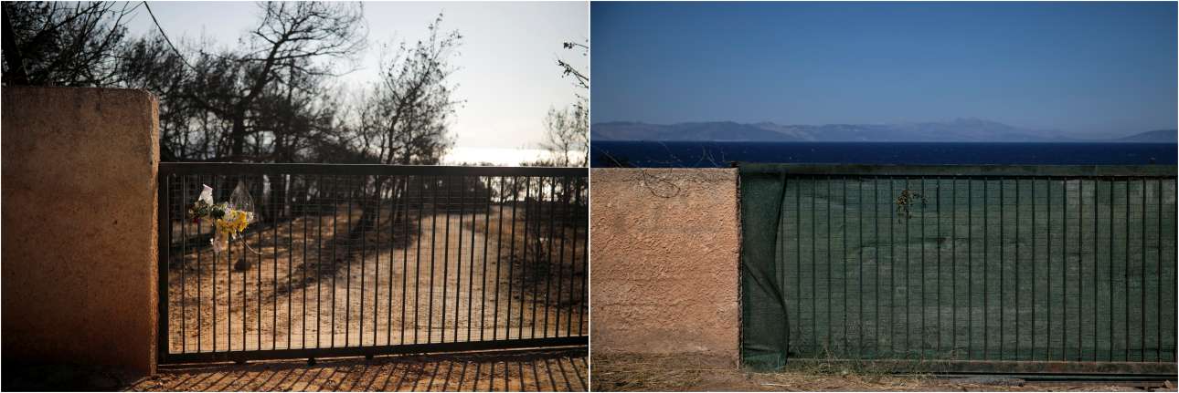 Στο σημείο αυτό βρέθηκαν 26 άνθρωποι μετά τη φονική πυρκαγιά στις 22 Αυγούστου 2018. Δεξιά, η ίδια πύλη στις 22 Ιουλίου 2019.