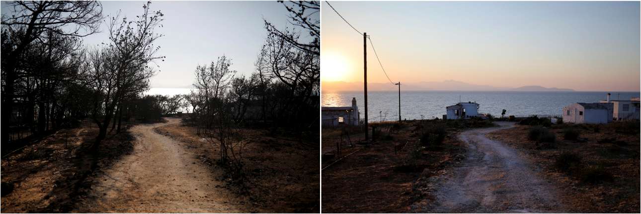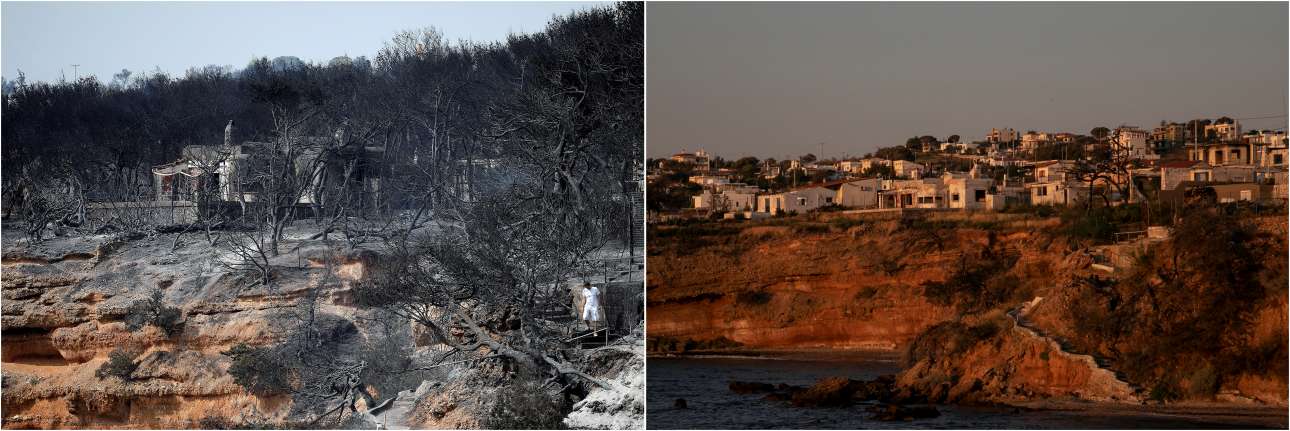 Στο σημείο αυτό, δύο άνθρωποι βρέθηκαν νεκροί μετά την πυρκαγιά στις 26 Ιουλίου 2018. Δεξιά, το ίδιο σημείο στις 22 Ιουλίου 2019.