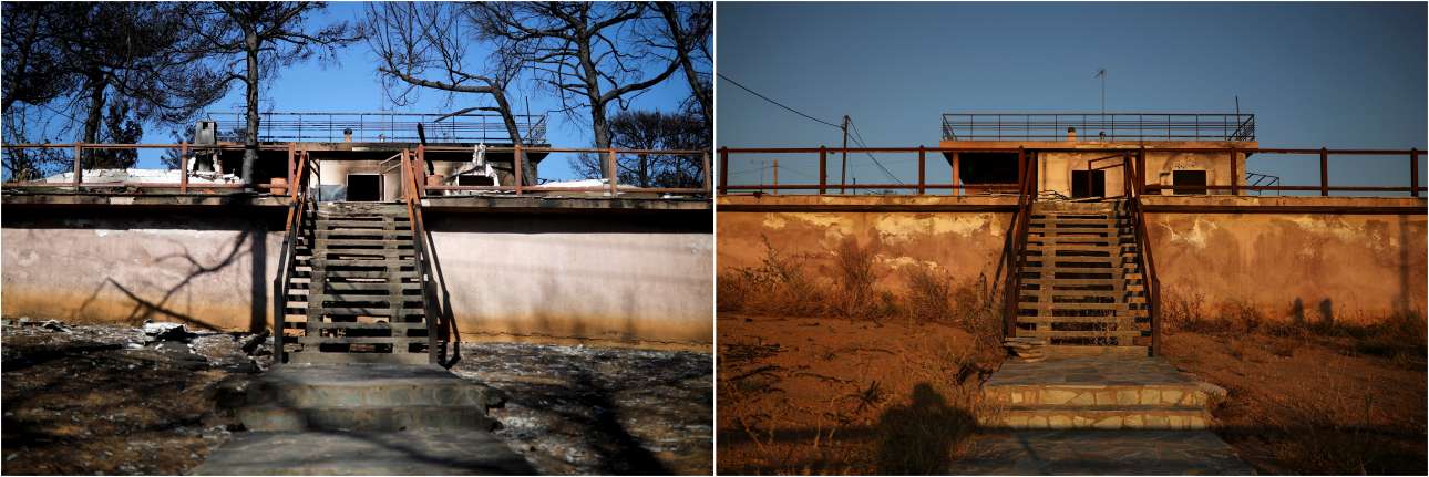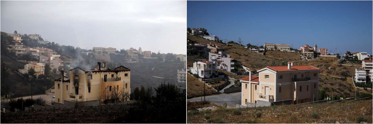 Το ίδιο καμένο σπίτι στις 22 Αυγούστου 2018 και στις 22 Ιουλίου 2019, στο Μάτι.