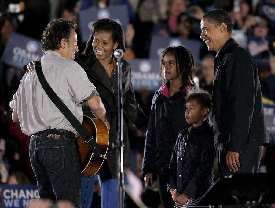 8 Νοεμβρίου 2016, στη Φιλαδέλφεια την παραμονή των προεδρικών εκλογών. Ο Σπρίνγκστιν συνομιλεί με τη Χίλαρι Κλίντον η οποία τελικά θα χάσει από τον Ντόναλντ Τραμπ. Πίσω διακρίνεται η Μισέλ Ομπάμα