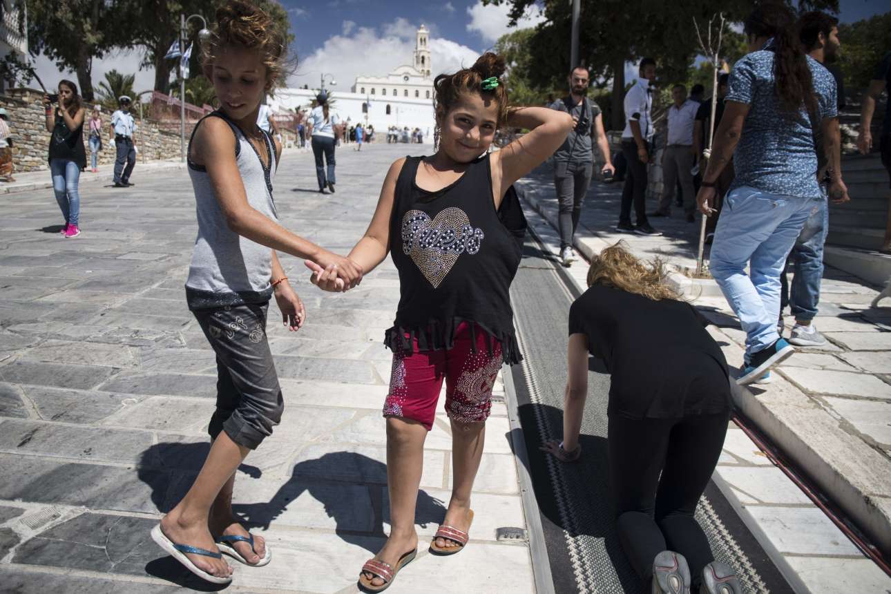 Πόζα και τάμα. Δύο κορίτσια ποζάρουν στον φακό ενώ δίπλα τους μια πιστή ανεβαίνει τον λόφο γονατιστή