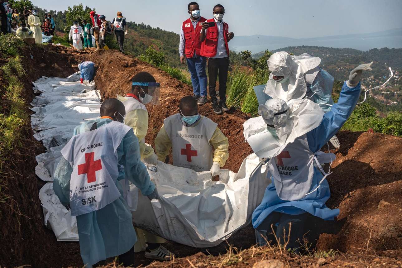 Μέλη του Ερυθρού Σταυρού του Κονγκό σε μαζικό τάφο όπου θάβονται πτώματα που βρέθηκαν στους δρόμους του Μπουκάβου μετά την κατάληψη της πόλης από τους αντάρτες του M23, τον Φεβρουάριο του 2025