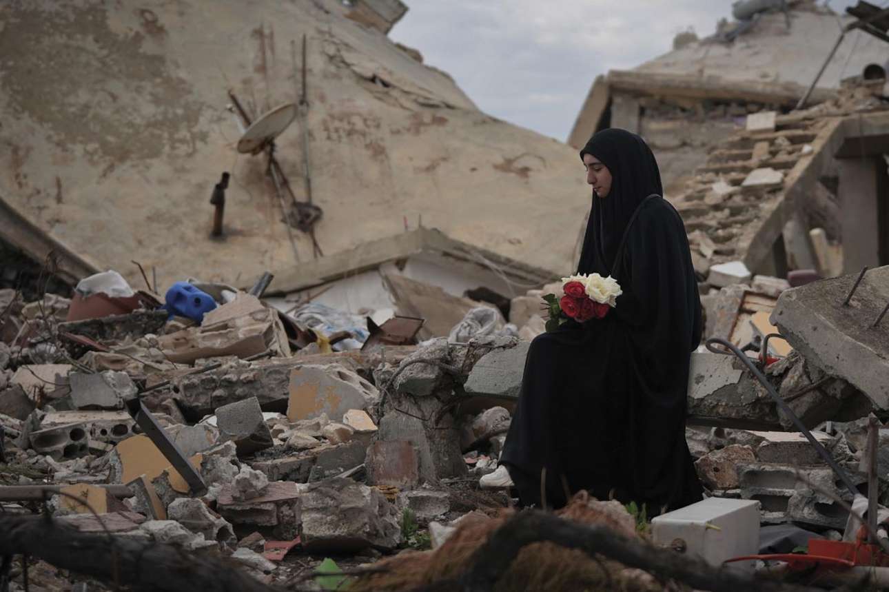 Πόλεμος Ισραήλ-Χεζμπολάχ: μια γυναίκα από το χωριό Αΐτα ελ-Τσαμπ κρατάει τριαντάφυλλα καθισμένη ανάμεσα στα ερείπια, Ιανουάριος 2025