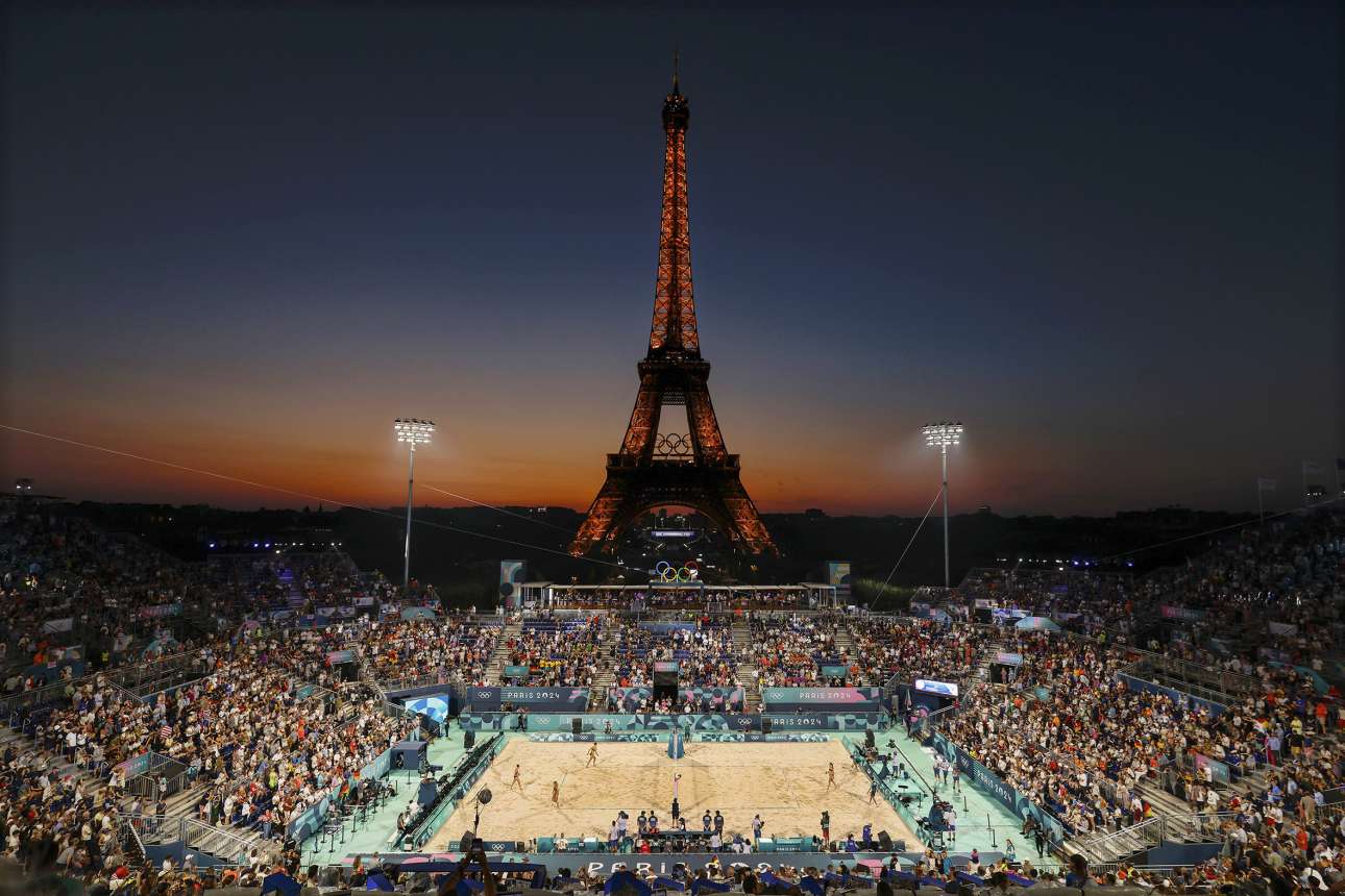 Καρτ ποστάλ από το Παρίσι: εμβληματικές σκηνές από τους Ολυμπιακούς Αγώνες. Οι Αμερικανίδες Χιουζ και Τσενγκ και οι Γερμανίδες Μίλερ και Τίλμαν προθερμαίνονται για τον αγώνα τους στην προκριματική φάση του γυναικείου beach volley, με φόντο τον Πύργο του Αϊφελ