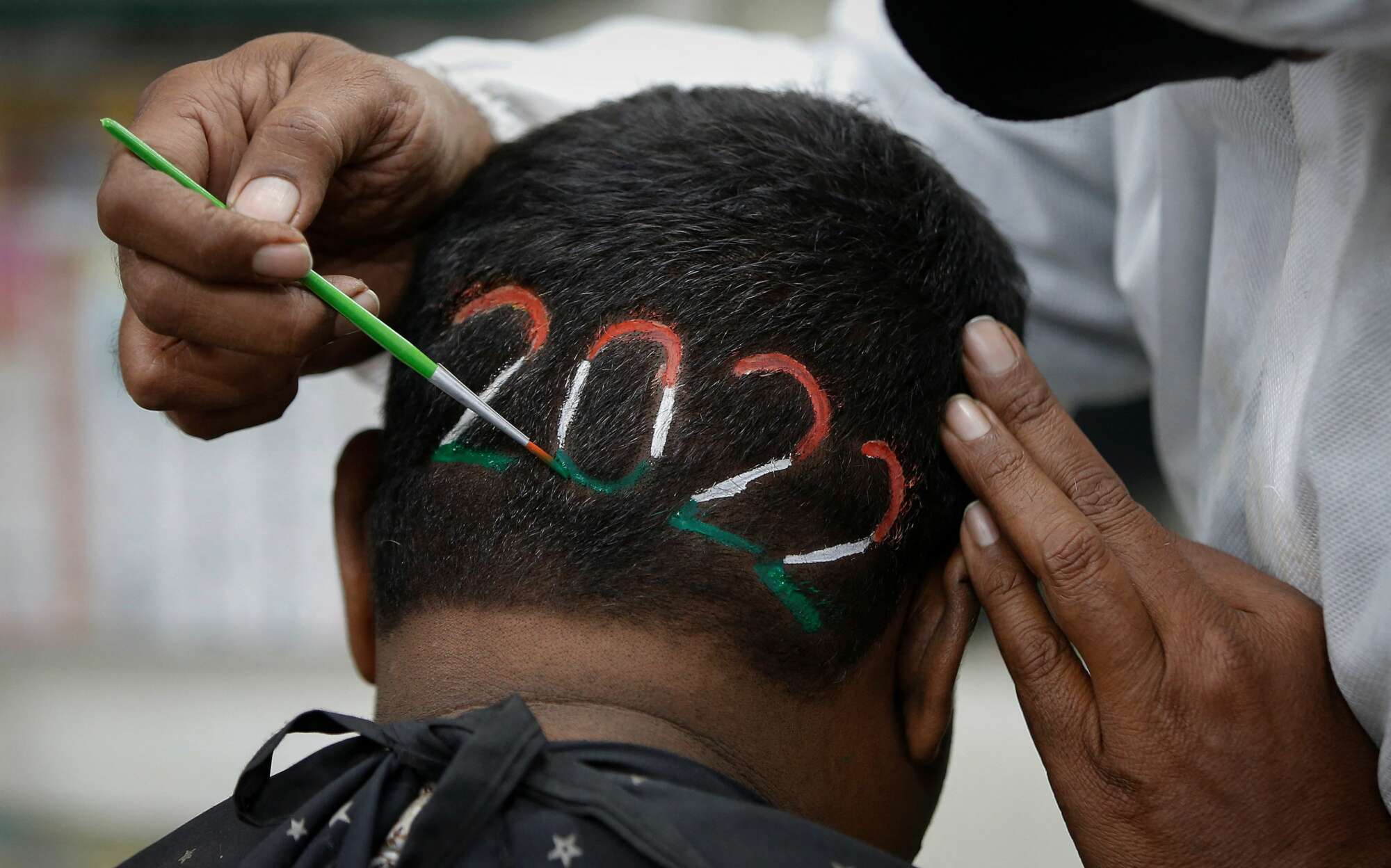 Μπαρμπέρης στο Αχμενταμπάντ της Ινδίας βάφει το 2022 στα χρώματα της ινδικής σημαίας, στο κεφάλι του πελάτη του