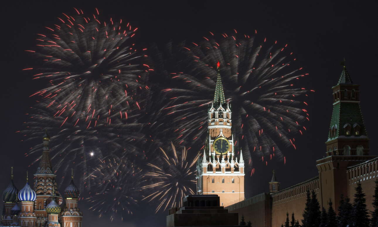 Πυροτεχνήματα φωτίζουν τον ουρανό της Μόσχας, στην Κόκκινη Πλατεία, η οποία ήταν εφέτος άδεια, λόγω Covid-19