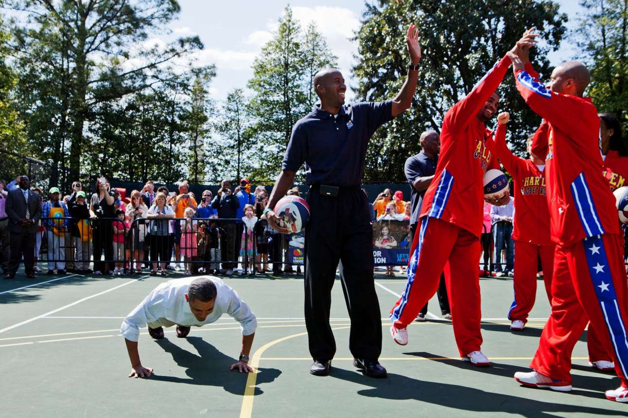 Λάτρης της γυμναστικής και του αθλητισμού, ο Ομπάμα κάνει κάμψεις στο γήπεδο μπάσκετ του Λευκού Οίκου ύστερα από αγώνα με τους διάσημους «Original Harlem Globetrotters»