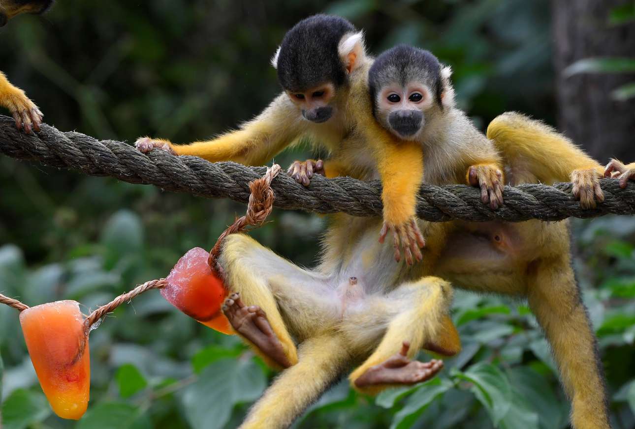 Τετάρτη, 27 Ιουνίου, Βρετανία. Σκιουρόμορφα Σαϊμίρι τρώνε παγωμένες λιχουδιές, μια ζεστή καλοκαιρινή μέρα στον ζωολογικό κήπο του Λονδίνου