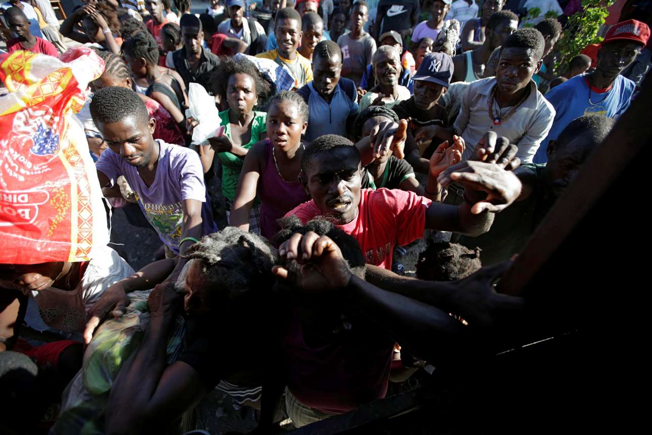 7 Οκτ. Και όσοι επιβίωσαν, μετά τον ισχυρό τυφώνα που έπληξε τις ευπαθείς κοινωνικές ομάδες της Αϊτής; Δεν έχουν στέγη, πρόσβαση σε τρόφιμα και είδη πρώτης ανάγκης. Εδώ, σε σχολείο που λειτουργεί ως καταφύγιο, στο χωριό Λες Κάγιες, εκτοπισμένοι κάτοικοι περιμένουν για τρόφιμα