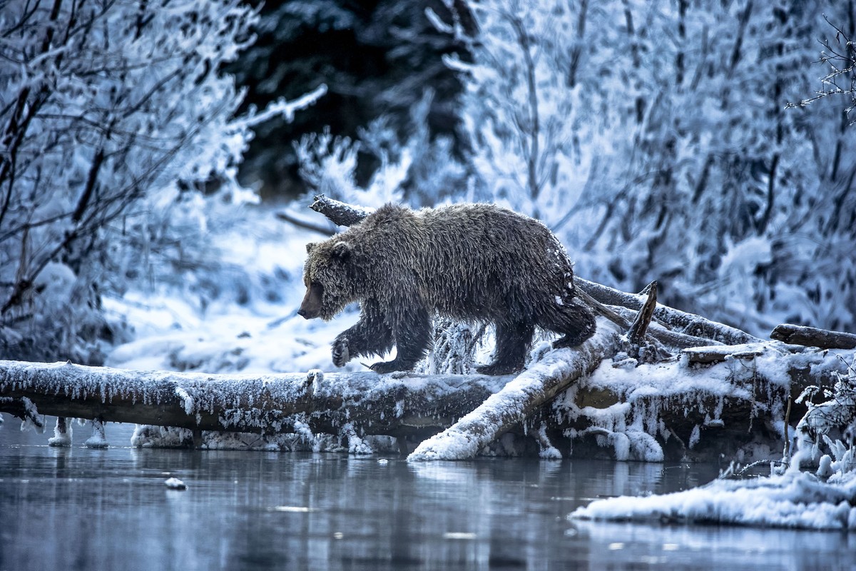 Η αρκούδα του πάγου έρχεται. Δύο ώρες με ελικόπτερο απέχει η πλησιέστερη πόλη από αυτό το σημείο στον ποταμό Fishing Branch στην περιοχή Γιούκον του Καναδά, μια τοποθεσία όπου το ποτάμι δεν παγώνει ποτέ, όσο κρύο κι αν κάνει. Η μέση θερμοκρασία ήταν περίπου -30 βαθμοί Κελσίου και ο Άντι Σκίλεν περίμενε και ήλπιζε ότι μια συγκεκριμένη θηλυκή αρκούδα θα χρησιμοποιούσε αυτό το κούτσουρο για να διασχίσει το ρέμα. Τελικά έκανε ακριβώς αυτό, και πήρε την εικόνα που είχε οραματιστεί - το τρίχωμά της, βρεγμένο από το ψάρεμα, είχε παγώσει σε παγοκρύσταλλους και «μπορούσες να τα ακούσεις να κουδουνίζουν καθώς περνούσε»