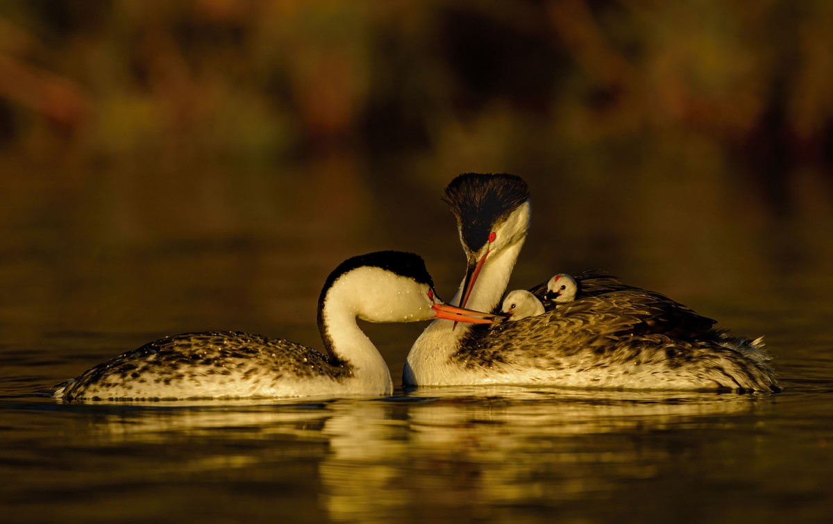 Οικογενειακή φωτογραφία στο Σαν Ντιέγκο της Καλιφόρνια. Οι νεοσσοί κάνουν μια άνετη βόλτα στην πλάτη ενός γονέα αμέσως μετά την εκκόλαψη. Αυτή η φωτογραφία τραβήχτηκε λίγες ημέρες μετά από μια καταιγίδα που δυστυχώς παρέσυρε σχεδόν όλες τις φωλιές των Aechmophorus clarkii...