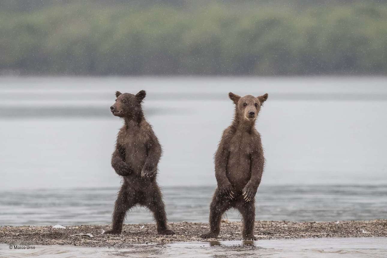 Εκατομμύρια σολομοί γεννιούνται κάθε χρόνο στη λίμνη Kuril στο νότιο τμήμα της ρωσικής χερσονήσου της Καμτσάτκα, στον Ειρηνικό, προσελκύοντας μεγάλο αριθμό καφέ αρκούδων. Οι εικονιζόμενες αρκούδες στέκονται όρθιες και κοιτάζουν με περιέργεια να δουν τι κάνει ο φωτογράφος. «Η βροχή που πέφτει πάνω στη λίμνη προσφέρει περισσότερη ατμόσφαιρα στο καρέ» σημειώνει ο Μάρκο Ούρσο