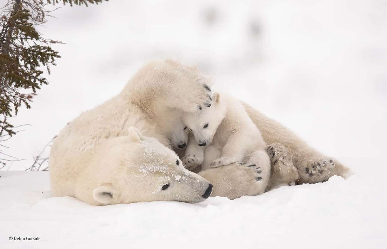 Οταν οι πολικές αρκούδες βγαίνουν από τις σπηλιές τους στην αρχή της άνοιξης, τα μικρά παραμένουν κοντά στις μητέρες τους για ζεστασιά και προστασία. Η φωτογράφος Ντέμπρα Γκάρσαϊντ περίμενε έξι ημέρες κοντά στη φωλιά τους στο εθνικό πάρκο Γαπούσκ, στη Μανιτόμπα του Καναδά, πριν επιτέλους βγουν. Μέσα σε πολικές θερμοκρασίες, από -35 μέχρι -55 βαθμούς Κελσίου, η φωτογράφος παραλίγο να πάθει κρυοπάγημα και να σταματήσει να λειτουργεί ο εξοπλισμός της, προκειμένου να απαθανατίσει αυτό το τρυφερό στιγμιότυπο