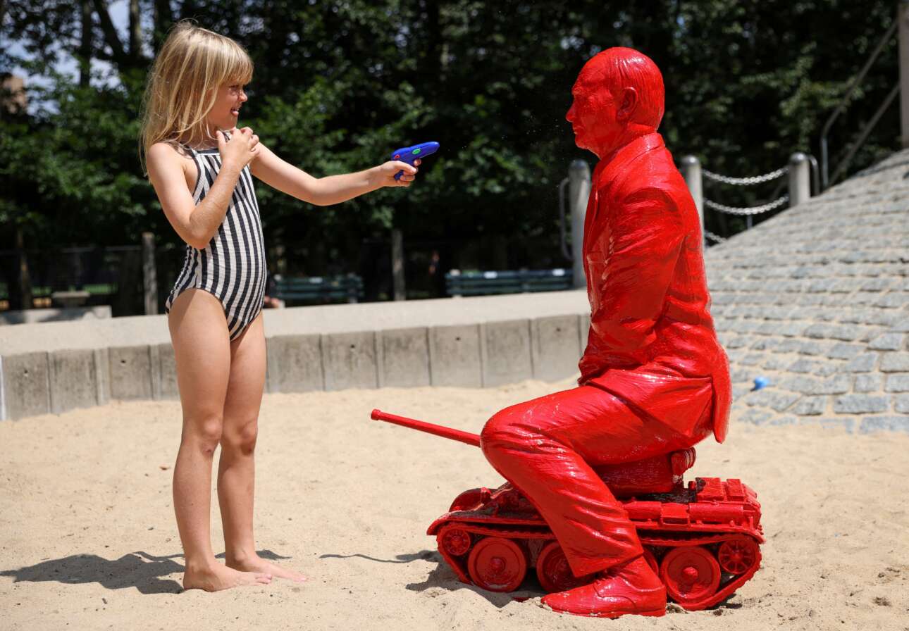 Γλυπτό-κελεπούρι για τον αμερικανικό φακό: ένα κοριτσάκι πυροβολεί με νεροπίστολο τον «αιμάτινο» Πούτιν που παίζει με το τανκς του – έργο κάποιου γάλλου «καλλιτέχνη του δρόμου» ονόματι Τζέιμς Κολομπίνα, ο οποίος το απέστειλε στο Μανχάταν για τα περαιτέρω