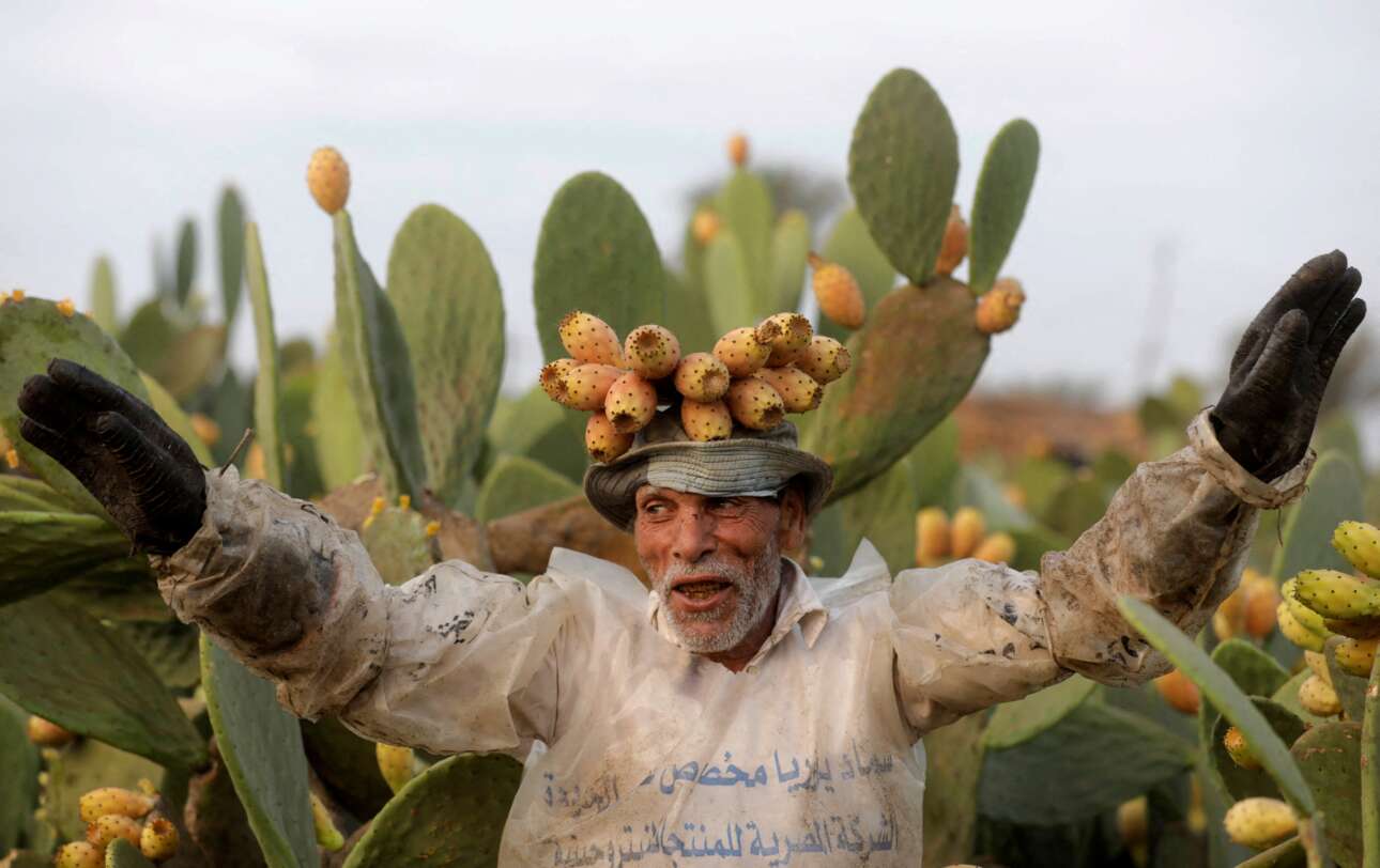 Φελάχος σε χωράφι του Δέλτα του Νείλου πανηγυρίζει την αύξηση της παραγωγής του σε φραγκόσυκα – για να μην τσιμπηθεί από τα αγκάθια τους, φοράει πάνω από την κελεμπία του ράκη από μουσαμάδες και στα χέρια του γάντια