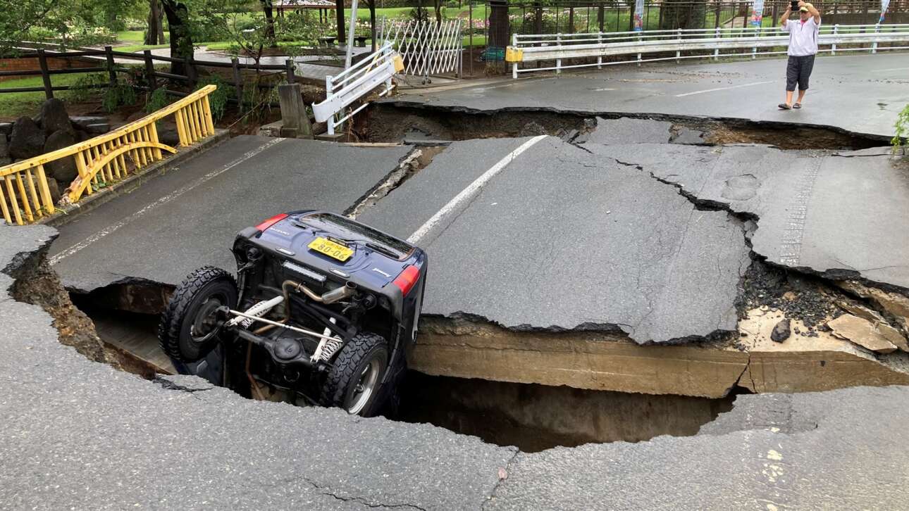 Υπάρχουν και στην Ιαπωνία εργολάβοι: η καλοκαιρινή βροχή έσκισε σαν χασέ το οδόστρωμα και το αυτοκίνητο που αμέριμνο διέσχιζε τον δρόμο βούτηξε στο χάσμα