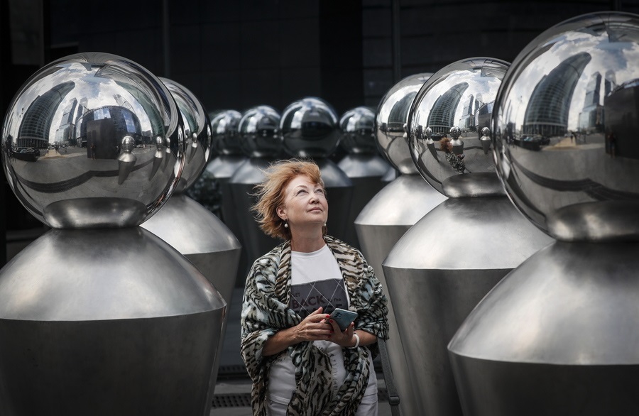 Φιλότεχνη Ρωσίδα περιφέρεται μέσα στην εγκατάσταση «Echo in Moscow» του Καναδολιβανέζου Χουσάμ Τσάγια – παρά το γεγονός ότι ο εικαστικός ζει στο Μόντρεαλ, συμμετέχει στην έκθεση του «Moscow City»