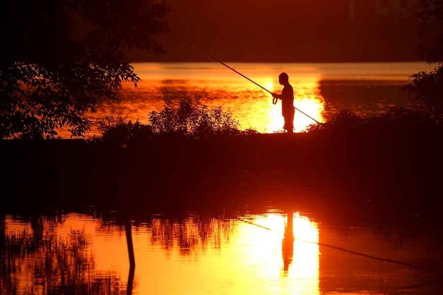 Ψυχοθεραπευτικό καρτ ποστάλ από το Ανόι: ψάρεμα με καλάμι στη χρυσοπόρφυρη λίμνη της ώρας του δειλινού καθώς τα πάντα ησυχάζουν