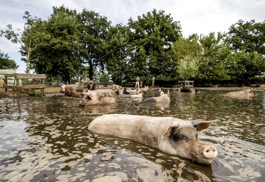 Γουρούνια φάρμας σβήνουν την κάψα τους από το αυγουστιάτικο κάμα στην ολλανδική λασπογούρνα τους, δηλαδή στο δικό τους μικρό πέλαγος που δεν έχει γοργόνες