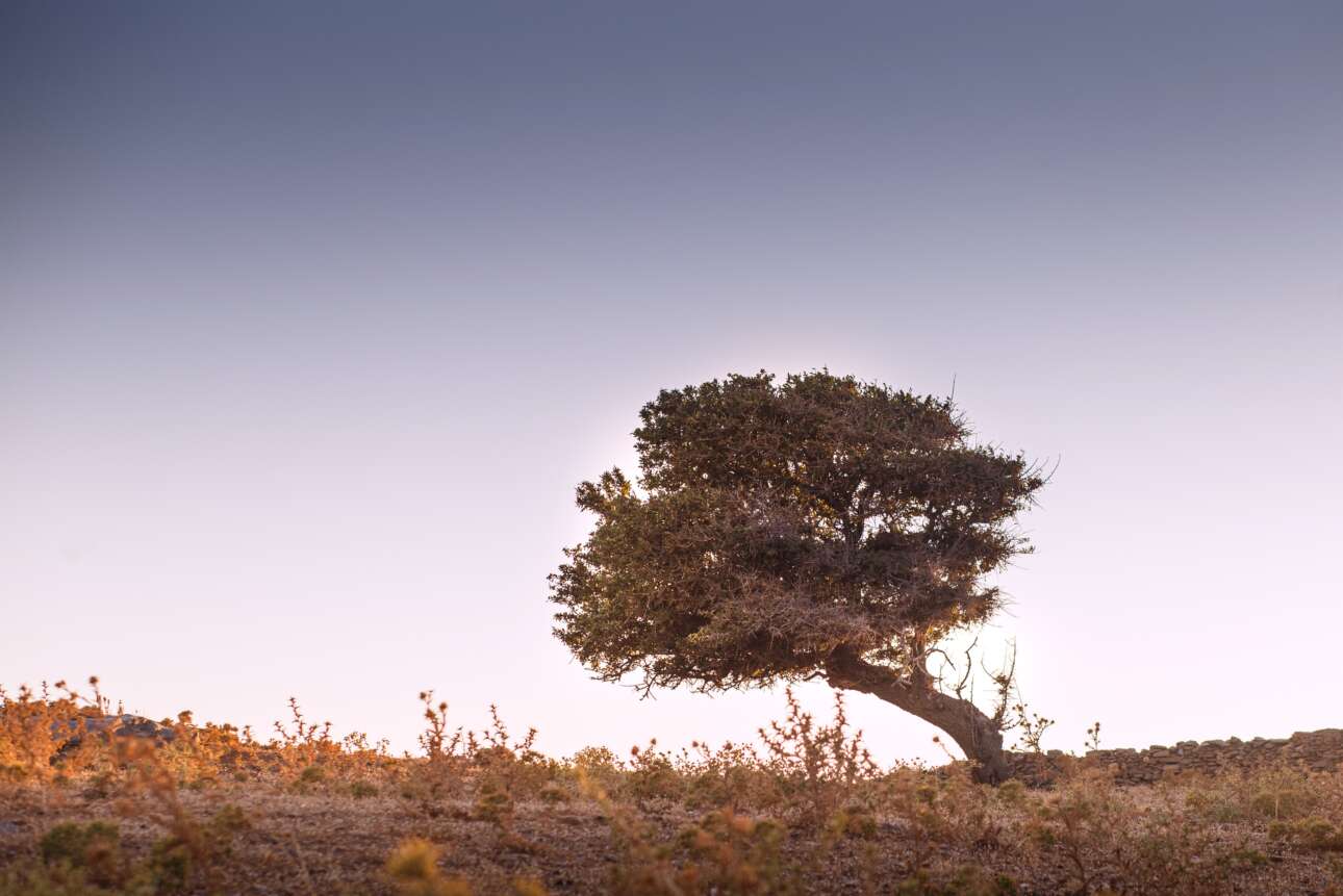 Ξερολιθιά δίπλα στο μοναδικό δένδρο –σε άλλη ώρα της θερινής ημέρας, και των δύο ο ίσκιος είναι σίδερο όπως το θέλει ο στίχος του Ρίτσου– και, βέβαια, παντού τριγύρω γαϊδουράγκαθα: καρέ από την Κύθνο, αλλά θα μπορούσε να είναι από οποιοδήποτε κυκλαδίτικο νησί