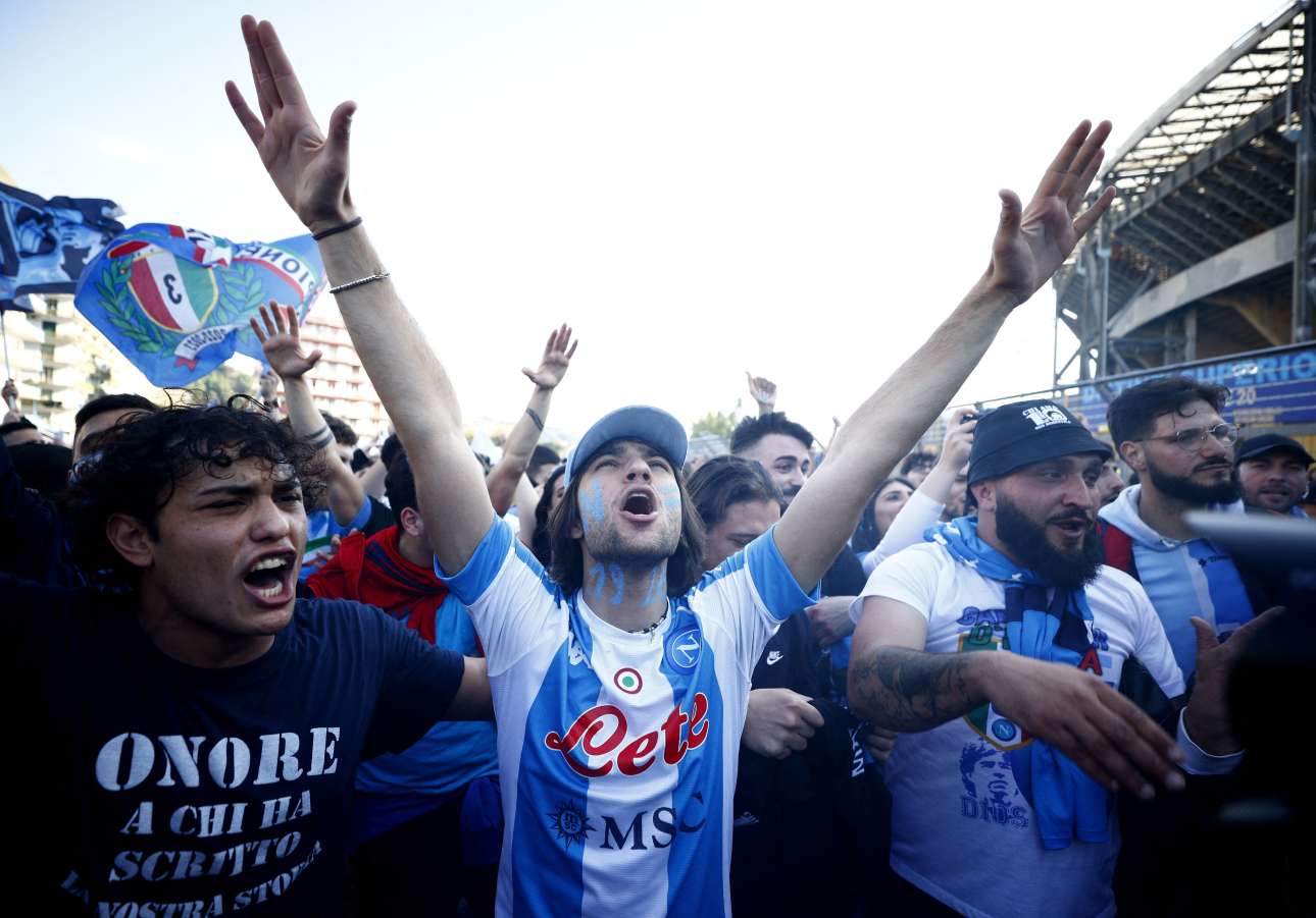 Ναπολιτάνοι συγκεντρωμένοι έξω από το γήπεδο της ομάδας τους –το βάφτισαν «Ντιέγκο Αρμάντο Μαραντόνα»– πανηγυρίζουν προκαταβολικώς την κατάκτηση του εφετινού ιταλικού πρωταθλήματος ποδοσφαίρου: «Τιμή σε αυτόν που έγραψε την ιστορία μας» έγραφαν οι μπλούζες τους, δηλαδή ζήτω των φτωχών το αρνί που είναι πολύ αχαμνό το άμοιρο και δεν μπορεί να τους χορτάσει