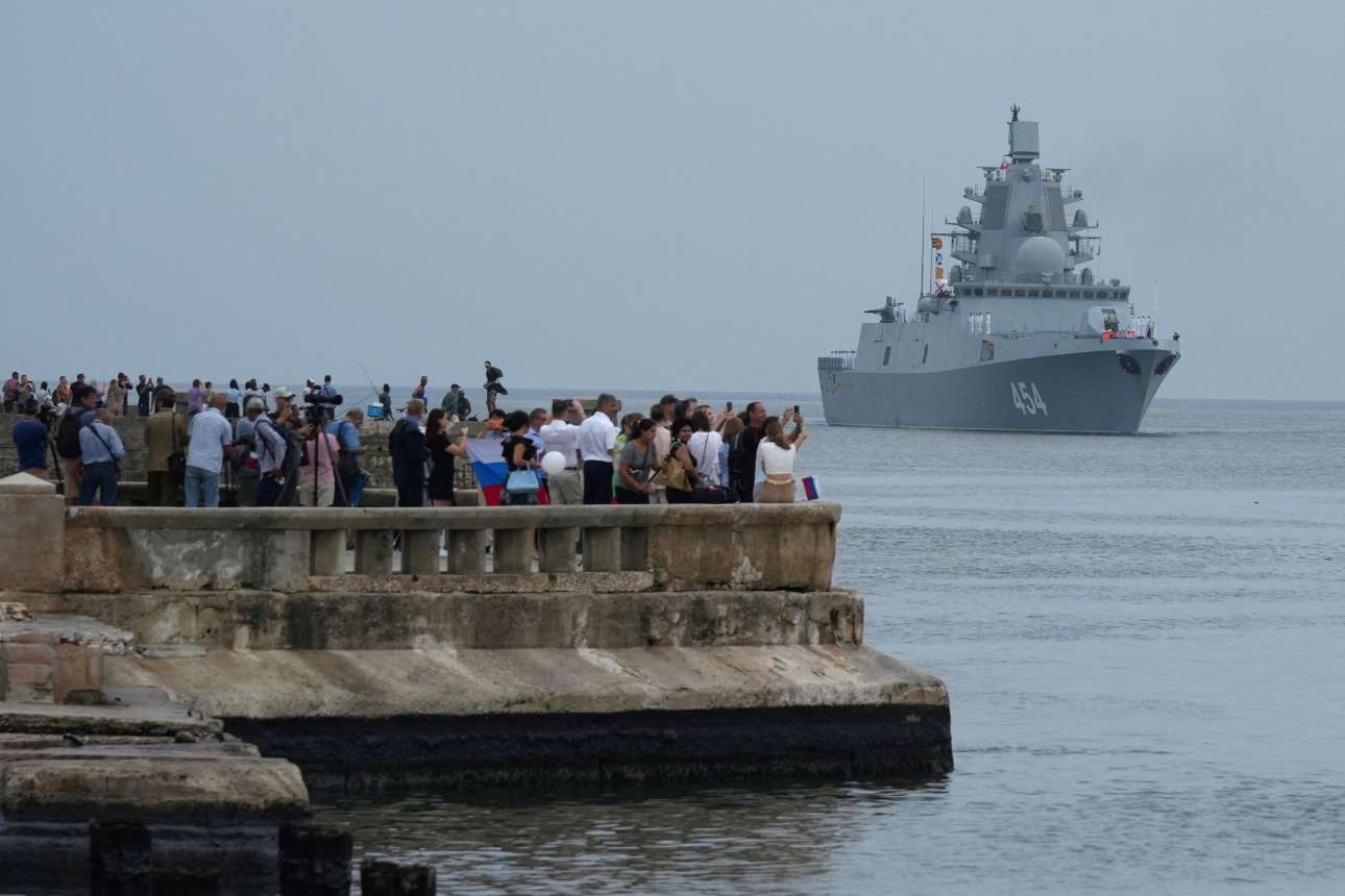 Λιγοστός κόσμος καλωσόρισε στην Αβάνα τη ρωσική φρεγάτα «Ναύαρχος Γκόρσκοφ» που κατέπλευσε εκεί έπειτα από ναυτική «περαντζάδα» στα ανοιχτά του Μαϊάμι – στα χέρια των φτωχών Κουβανών η ρωσική σημαία αντικατέστησε τη σοβιετική