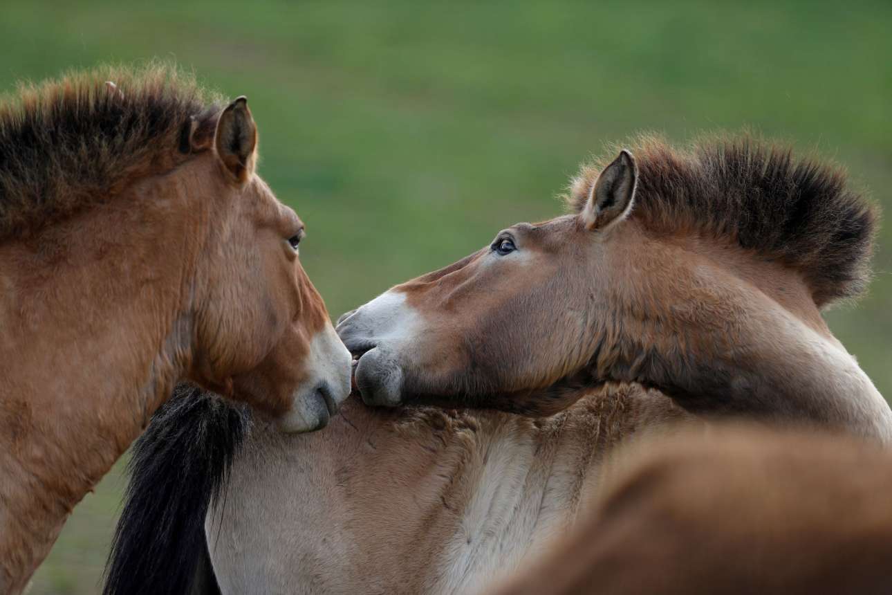 Δύο βραχύσωμα πλην στιβαρά μογγολικά άλογα –του είδους Πρεβάλσκι, το οποίο θεωρείται το μοναδικό γνησίως άγριο– παίζουν σε ένα τσέχικο λιβάδι εντός περιφραγμένης έκτασης