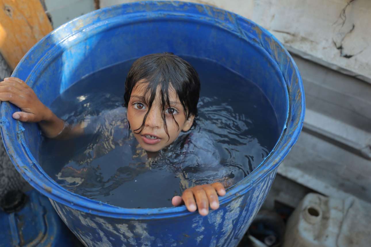 Κορίτσι από καταυλισμό σαν εκείνον που βομβάρδισαν οι Ισραηλινοί για να απελευθερώσουν τέσσερις ομήρους της Χαμάς δροσίζεται μέσα σε μπιτόνι με νερό – ο καύσωνας είναι ένα παραπάνω βάσανο για τους παλαιστινίους πρόσφυγες που ζουν σε τσαντίρια