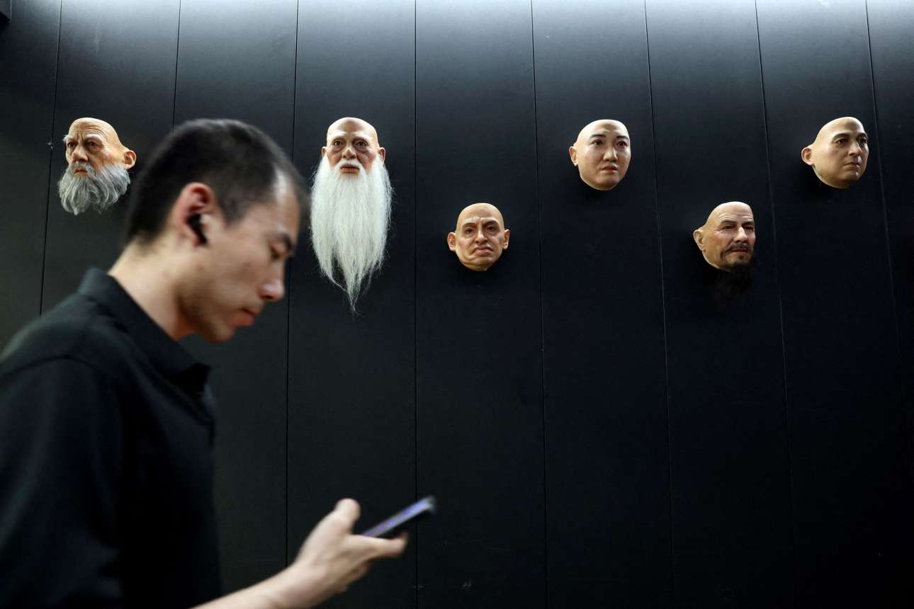 Ζώσα κεφαλή (απορροφημένη από smartphone) και έξι ρομποτικές, άψυχες αλλά ευρείας γκάμας – προϊόντα Κίνας με μορφές ορθόδοξου παπά (αριστερά), μετρ του κουνγκ φου με πάλλευκη γενειάδα, ακόμη και χαφιέ της όποιας χούντας ή μαφιόζου (στο μέσον)