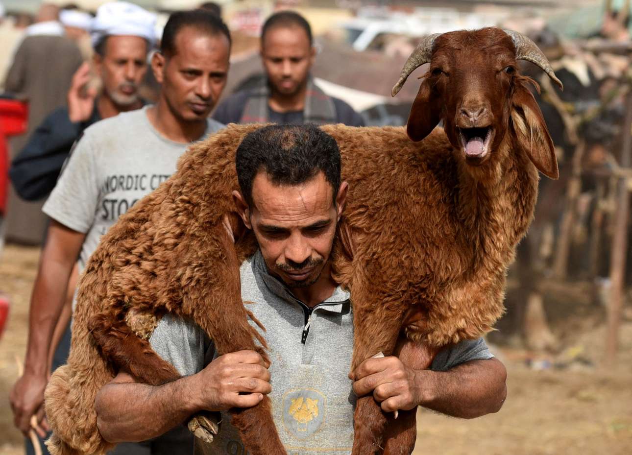 Τελευταία βελάσματα ευχαρίστησης για την επαφή με τον άνθρωπο, αθώα και απονήρευτα – ο αιγύπτιος κτηνοτρόφος, όμως, μάλλον λυπημένος, μετέφερε στους ώμους του το ζωντανό του επειδή μόλις το πούλησε για σφάγιο