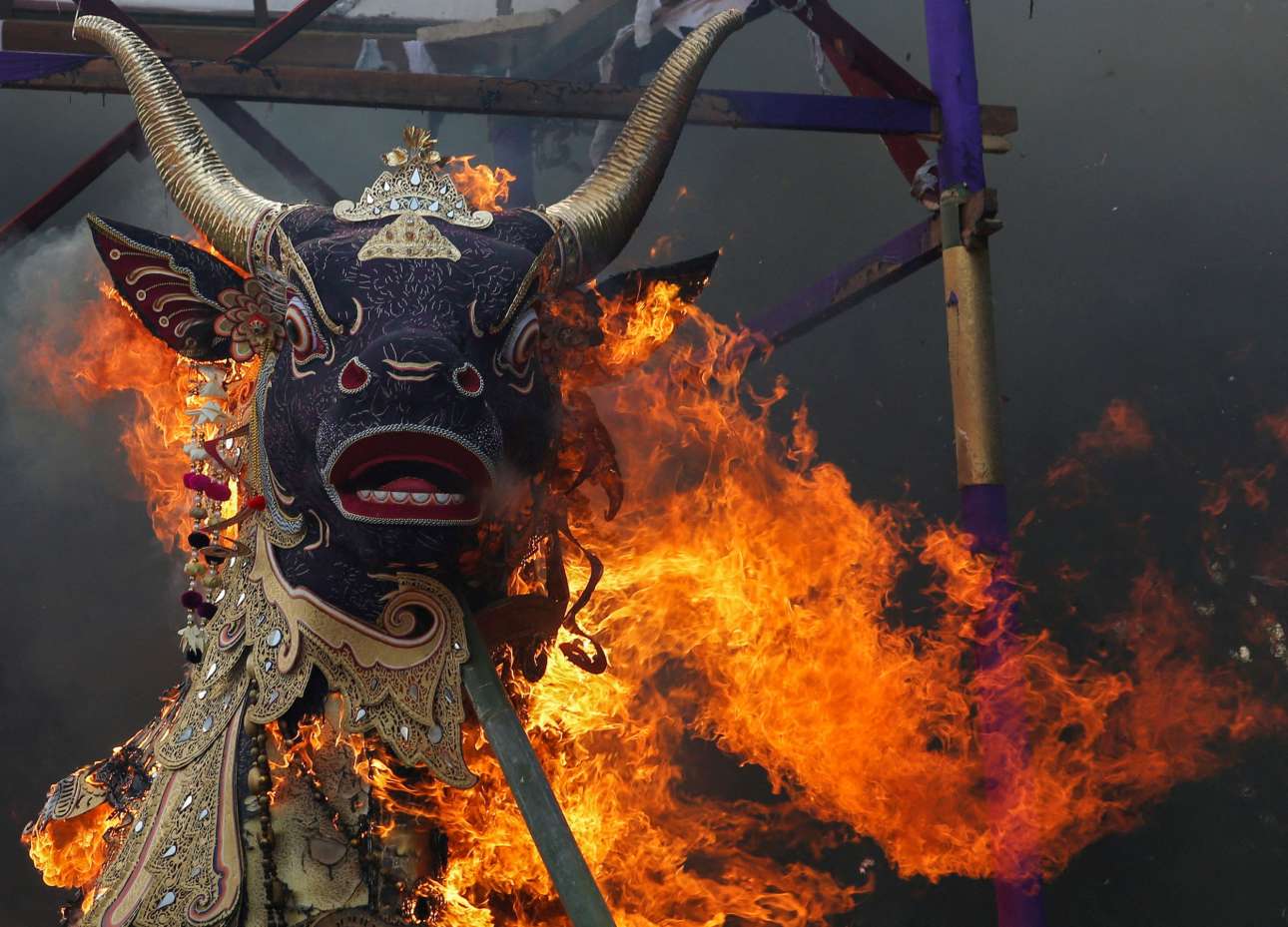 Σε βασιλική νεκρική πυρά στο Μπαλί πυρπολήθηκε χρυσοποίκιλτο ομοίωμα ταύρου που περιείχε το φέρετρο με τον μακαρίτη – εικόνα πομπώδης, αταίριαστη με τα δικά μας έθιμα της κηδείας και του πένθους